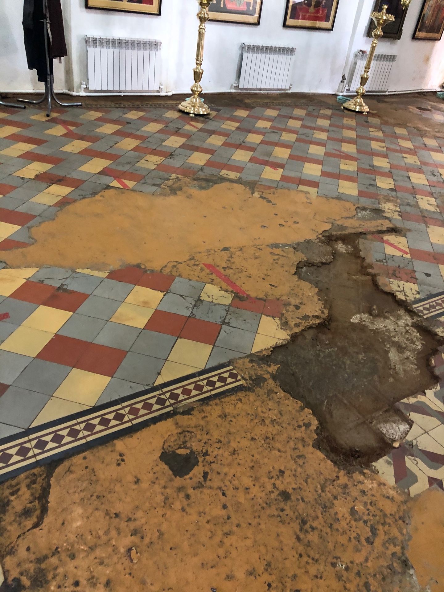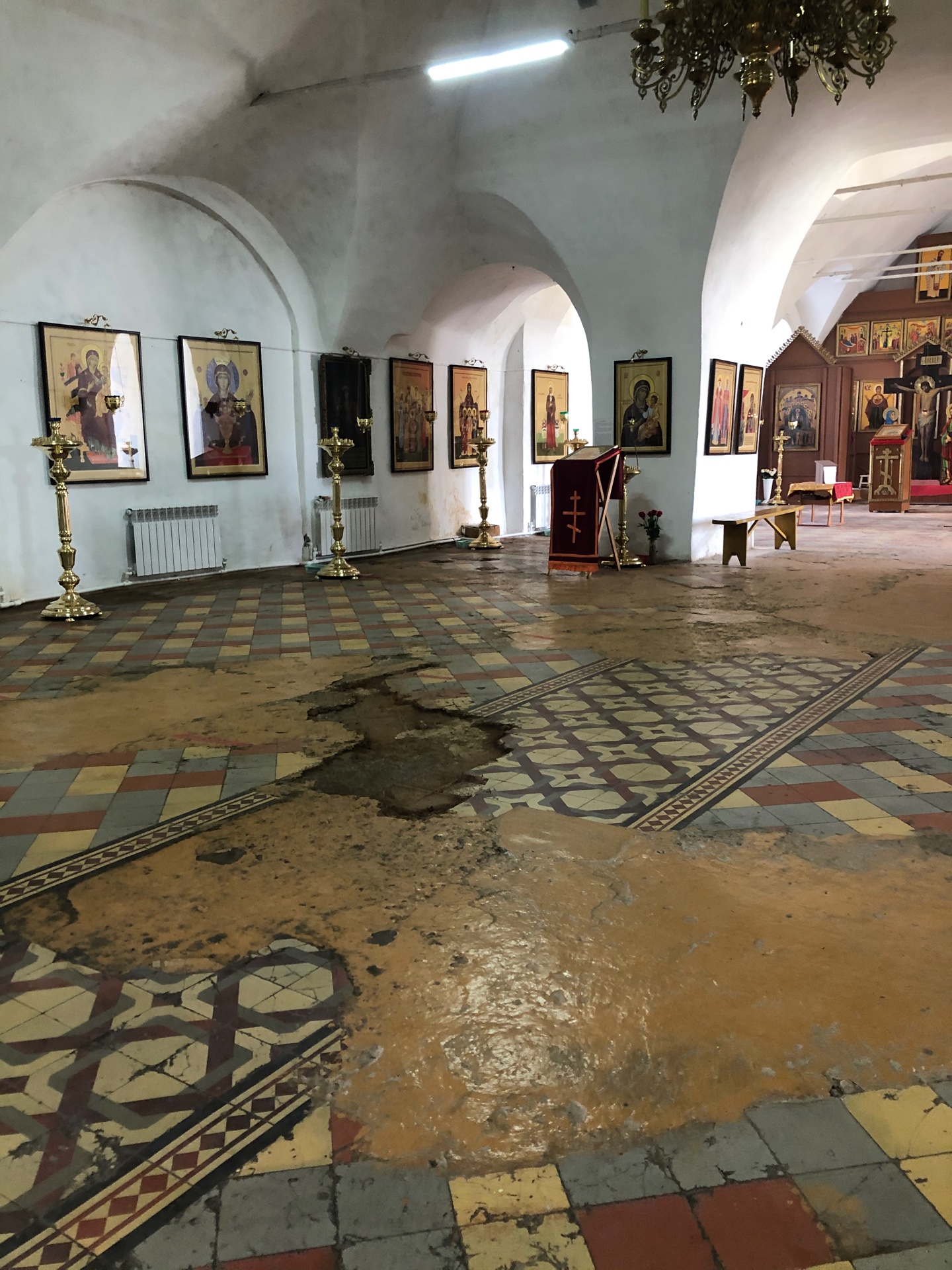 Ремонт полов – насущная необходимость. Историческое покрытие восстановить уже невозможно. Поэтому было решено облицевать полы керамогранитом красивого бежевого цвета. И ковер от входа к алтарю из плитки тоже будет, правда, более скромный, чем в XIX веке.