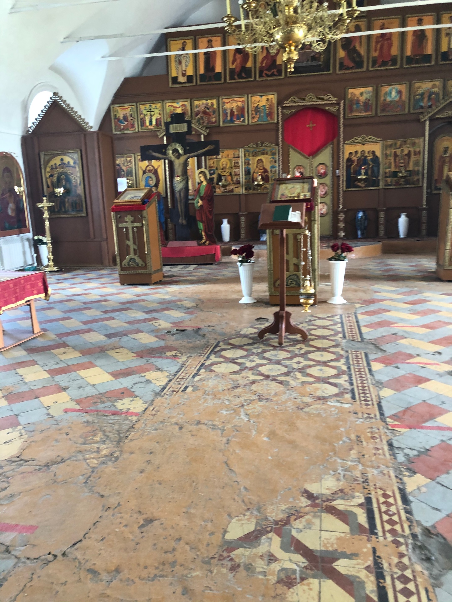 В советское время в церкви был заводской цех, и когда в ней устанавливали станки, полы были сильно повреждены. Они и сейчас разбиты, что грозит падением прихожанам и священнослужителям.