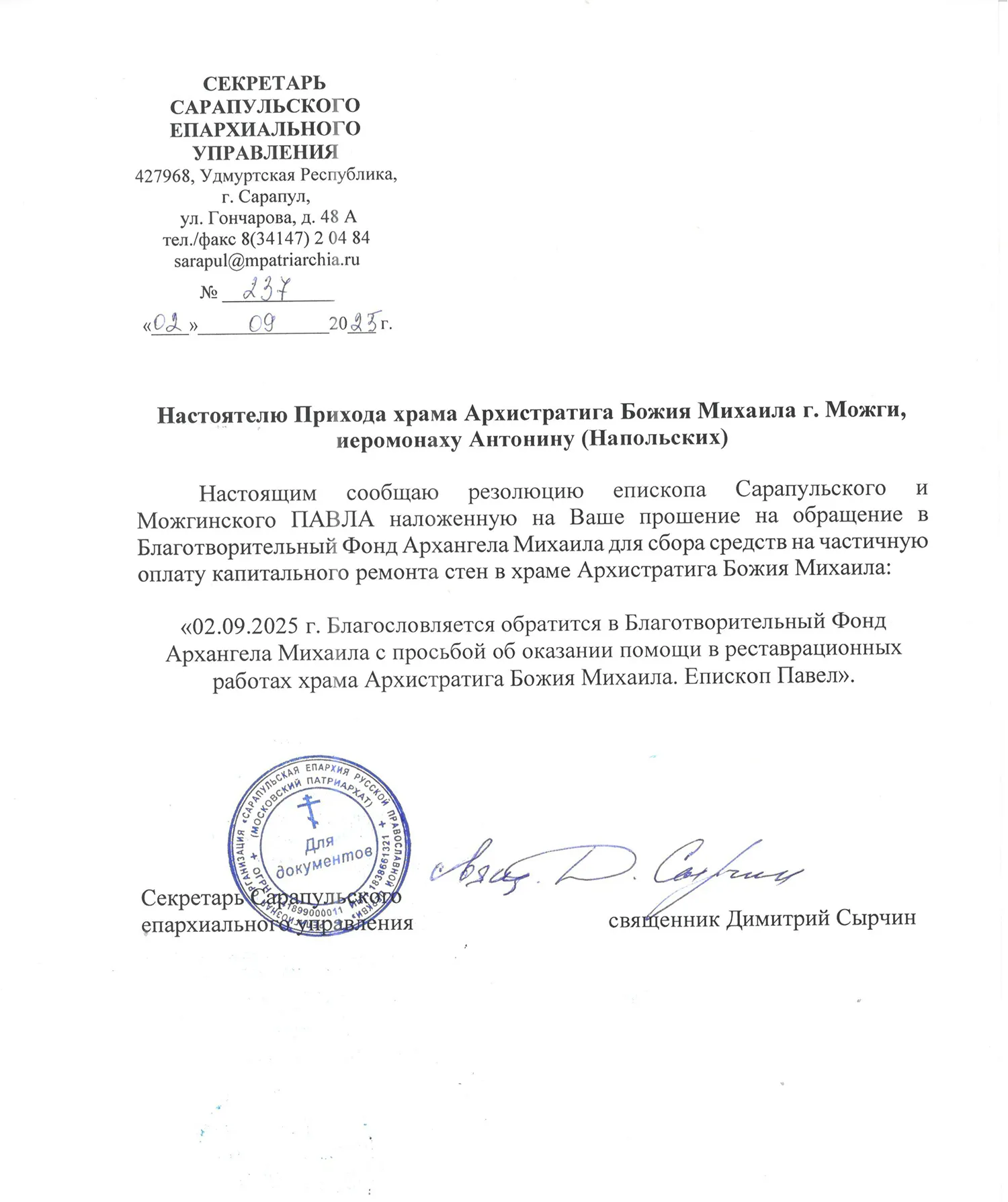 Ремонтные и восстановительные работы в Михайловском соборе продолжаются до сих пор. Они необходимы, чтобы возвратить храму былое благолепие. И конечно, средств не хватает. В октябре 2022 года исполнилось 120 лет с начала богослужебной жизни в городе Можга. Настоятель и прихожане храма обратились к нам с просьбой помочь собрать средства, чтобы в юбилейный для храма год расписать хотя бы конху его алтаря – и мы начали помогать. Продолжим создание церковной красоты, образа Рая Божия на земле! Поможем привести в порядок стены храма!