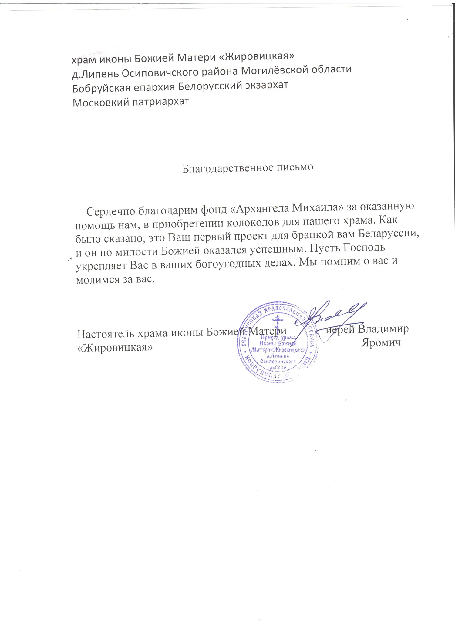 Храм в честь Жировичской иконы Пресвятой Богородицы – наш первый подопечный на территории республики Беларусь! Люди со всей России, принявшие участие в этом сборе, совершили вклад в укрепление дружбы между нашими братскими странами, в укрепление церковного единства! Всем миром мы подарили колокола церкви в деревне Липень! Часть средств была пожертвована непосредственно на этот объект, еще часть мы добавили из Общего сбора.