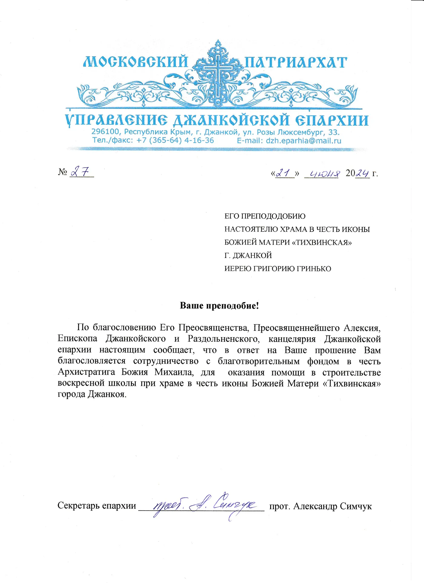 Помочь храму в честь иконы Божией Матери «Тихвинская» в г. Джанкой можно онлайн на сайте или отправив СМС на короткий номер 3434 с текстом «ДЖАНКОЙ» и через пробел указав сумму (Например: ДЖАНКОЙ 500).