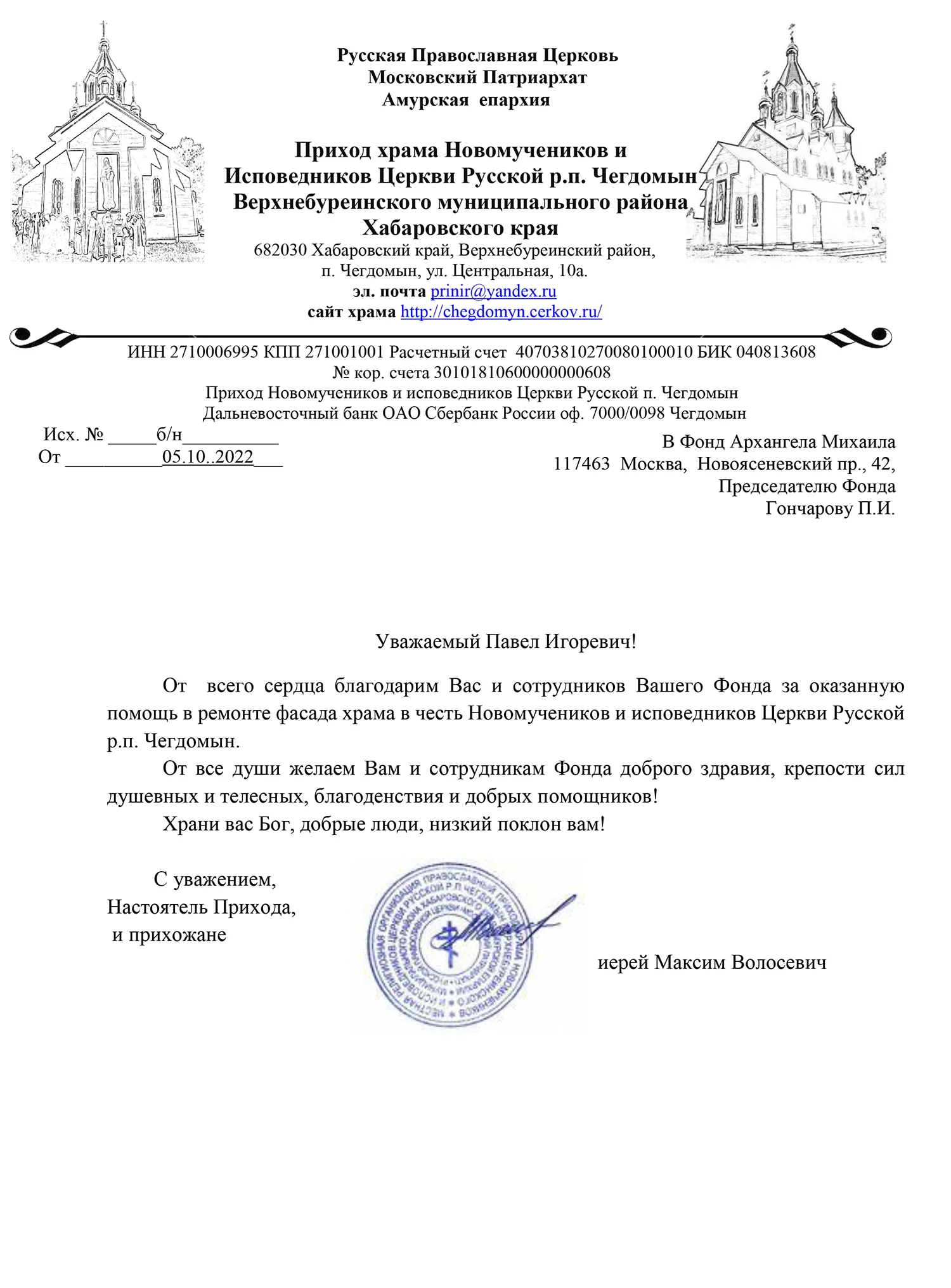 Благодарим Вас за интерес к нашим объектам попечения! Неравнодушные люди, объединенные нашим Фондом, помогли Храму Новомучеников и Исповедников Церкви Русской р.п. Чегдомын, но еще многие храмы очень ждут, когда будут собраны средства на их нужды.