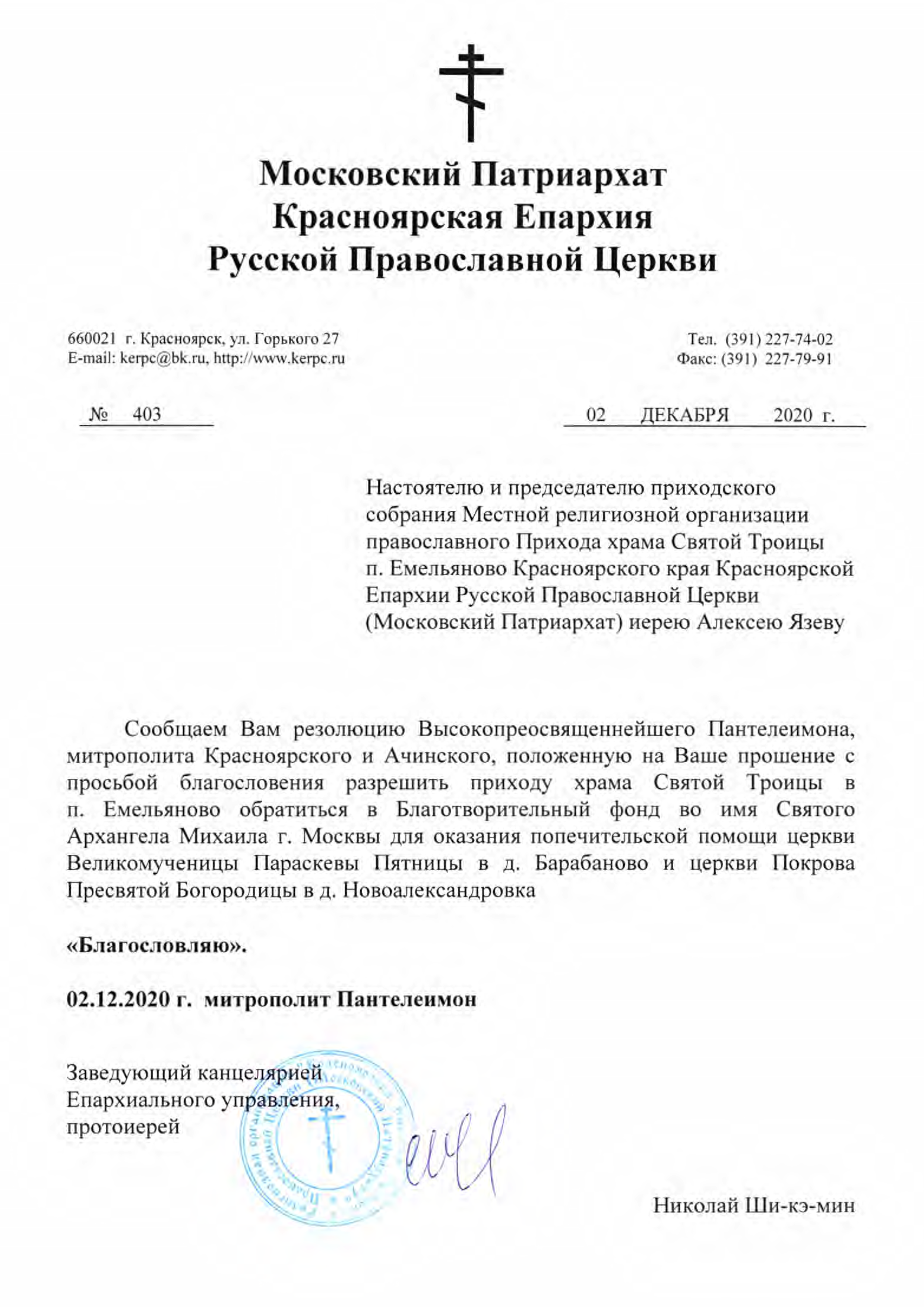 - Благословение Епархии на обращение в Фонд