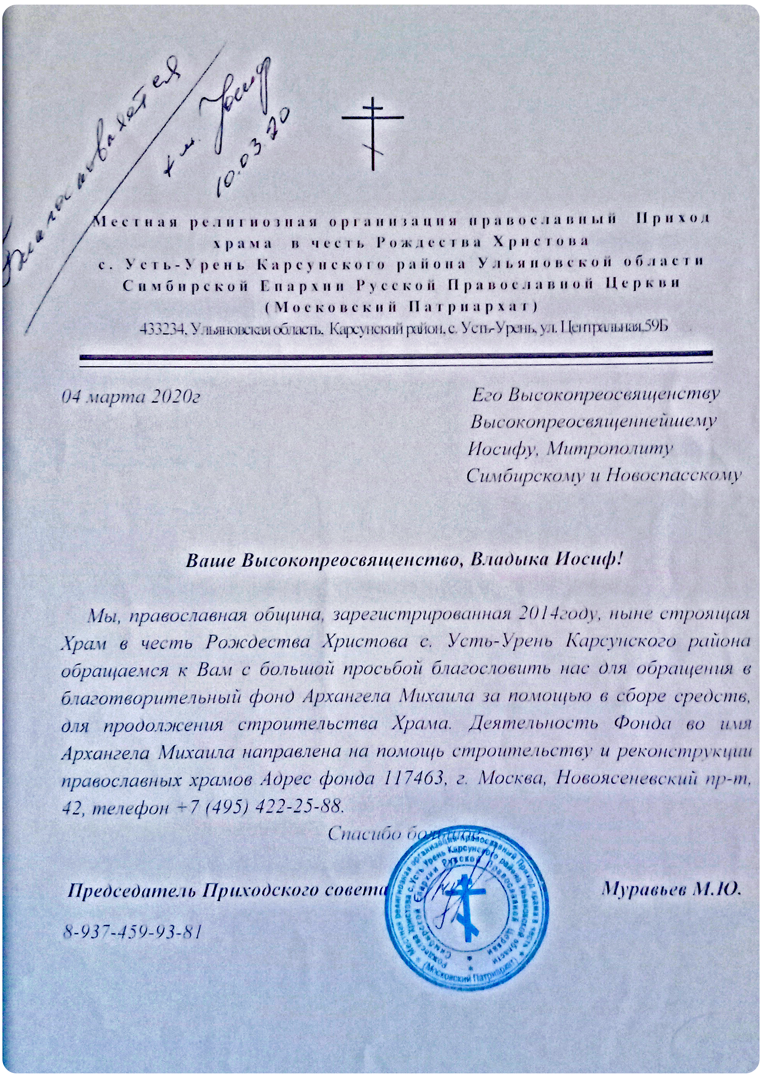 - Благословение Епархии на обращение в Фонд