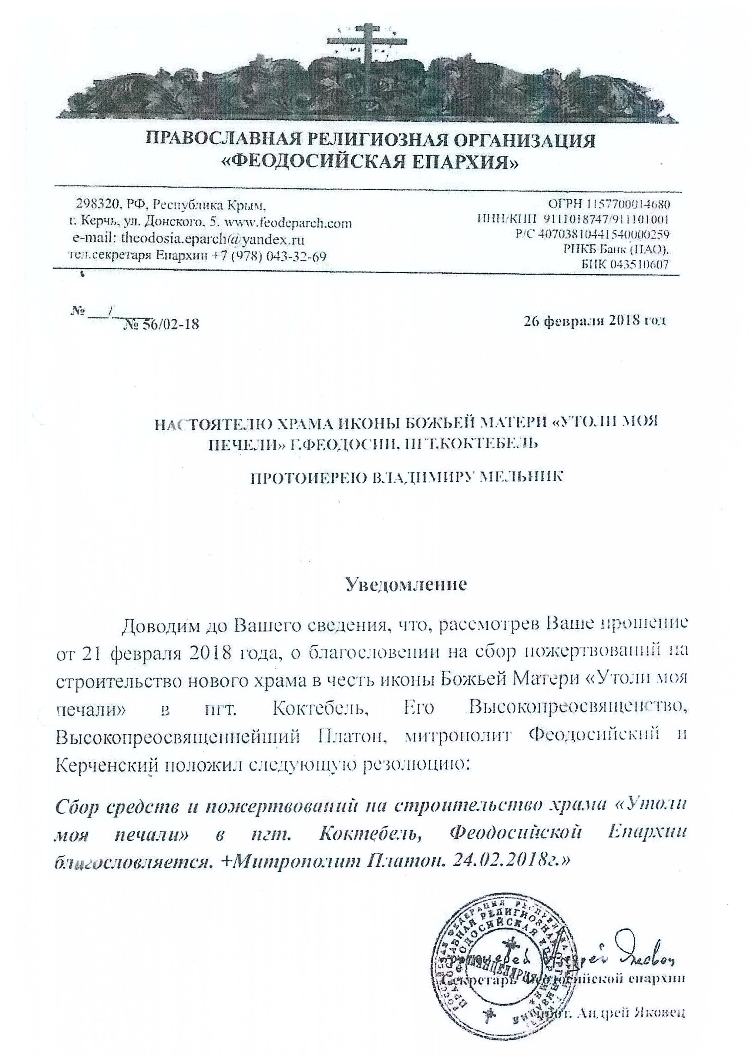 Благодарим Вас за интерес к нашим объектам попечения! Неравнодушные люди, объединенные нашим Фондом, помогли Храму в честь иконы Божией Матери «Утоли моя печали» в Коктебеле, но еще многие храмы очень ждут, когда будут собраны средства на их нужды.
