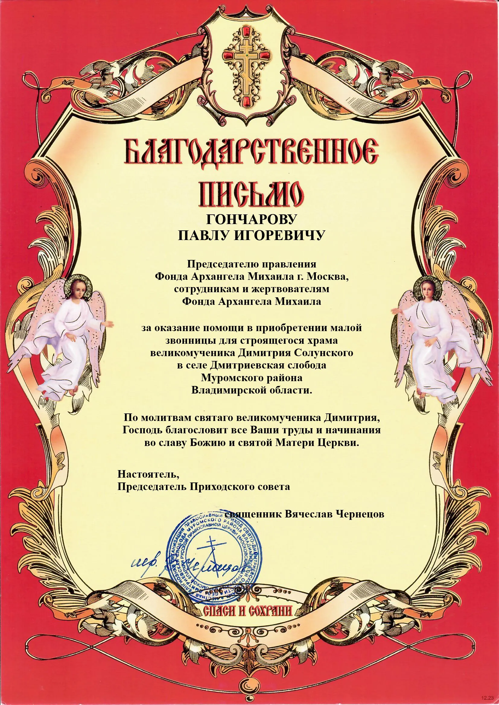 БЛАГОТВОРИТЕЛЬНЫЙ ФОНД СОДЕЙСТВИЯ СТРОИТЕЛЬСТВУ И РЕКОНСТРУКЦИИ ХРАМОВ ВО ИМЯ СВЯТОГО АРХАНГЕЛА МИХАИЛА (Председатель Cовета учредителей: Гончаров Павел Игоревич),