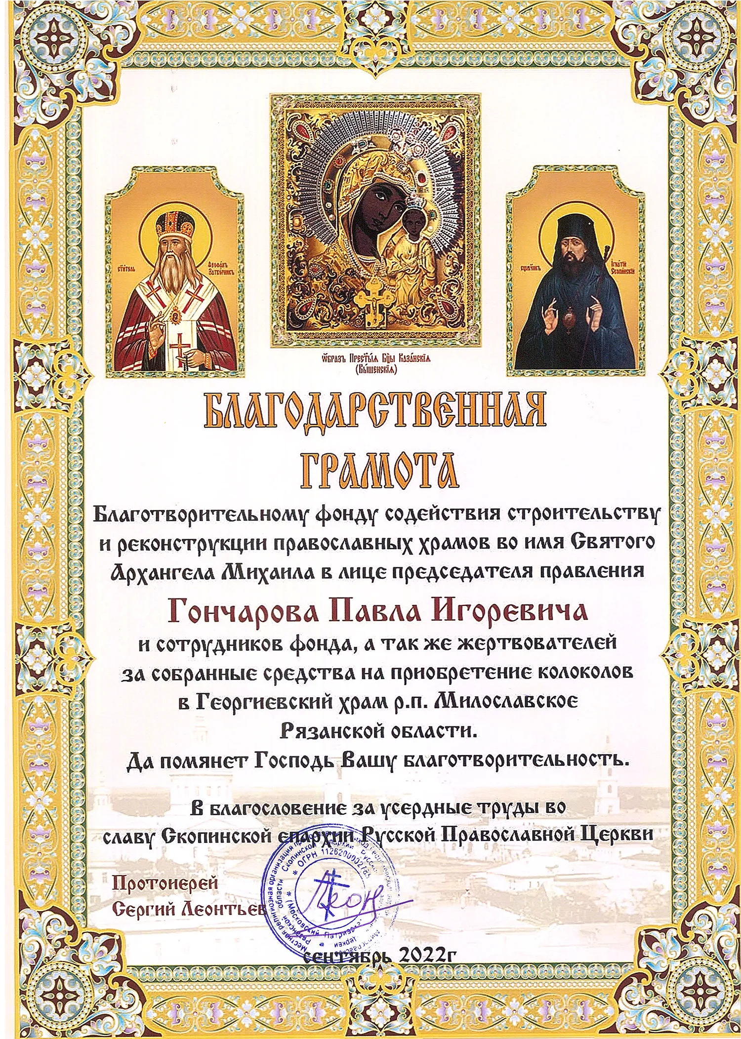 БЛАГОТВОРИТЕЛЬНЫЙ ФОНД СОДЕЙСТВИЯ СТРОИТЕЛЬСТВУ И РЕКОНСТРУКЦИИ ХРАМОВ ВО ИМЯ СВЯТОГО АРХАНГЕЛА МИХАИЛА (Председатель Cовета учредителей: Гончаров Павел Игоревич),