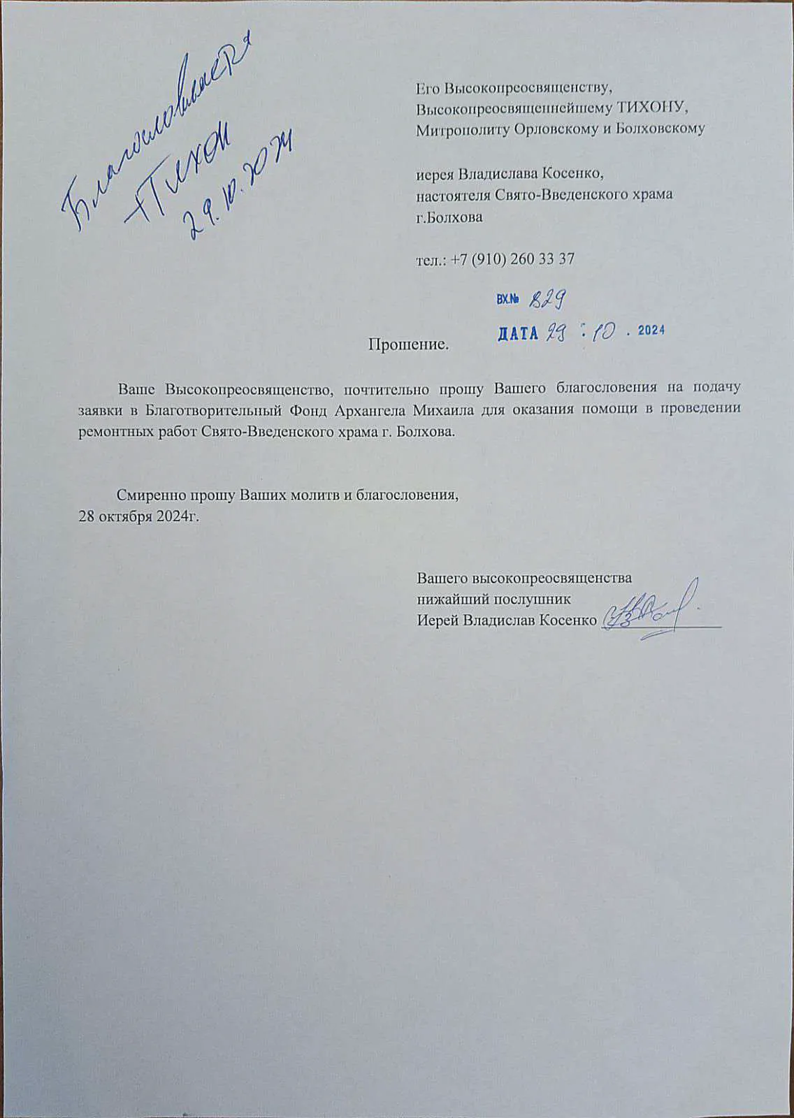 Помочь Свято-Введенскому храму в г. Болхов можно онлайн на сайте или отправив СМС на короткий номер 3434 с текстом «БОЛХОВ» и через пробел указав сумму (Например: БОЛХОВ 500).