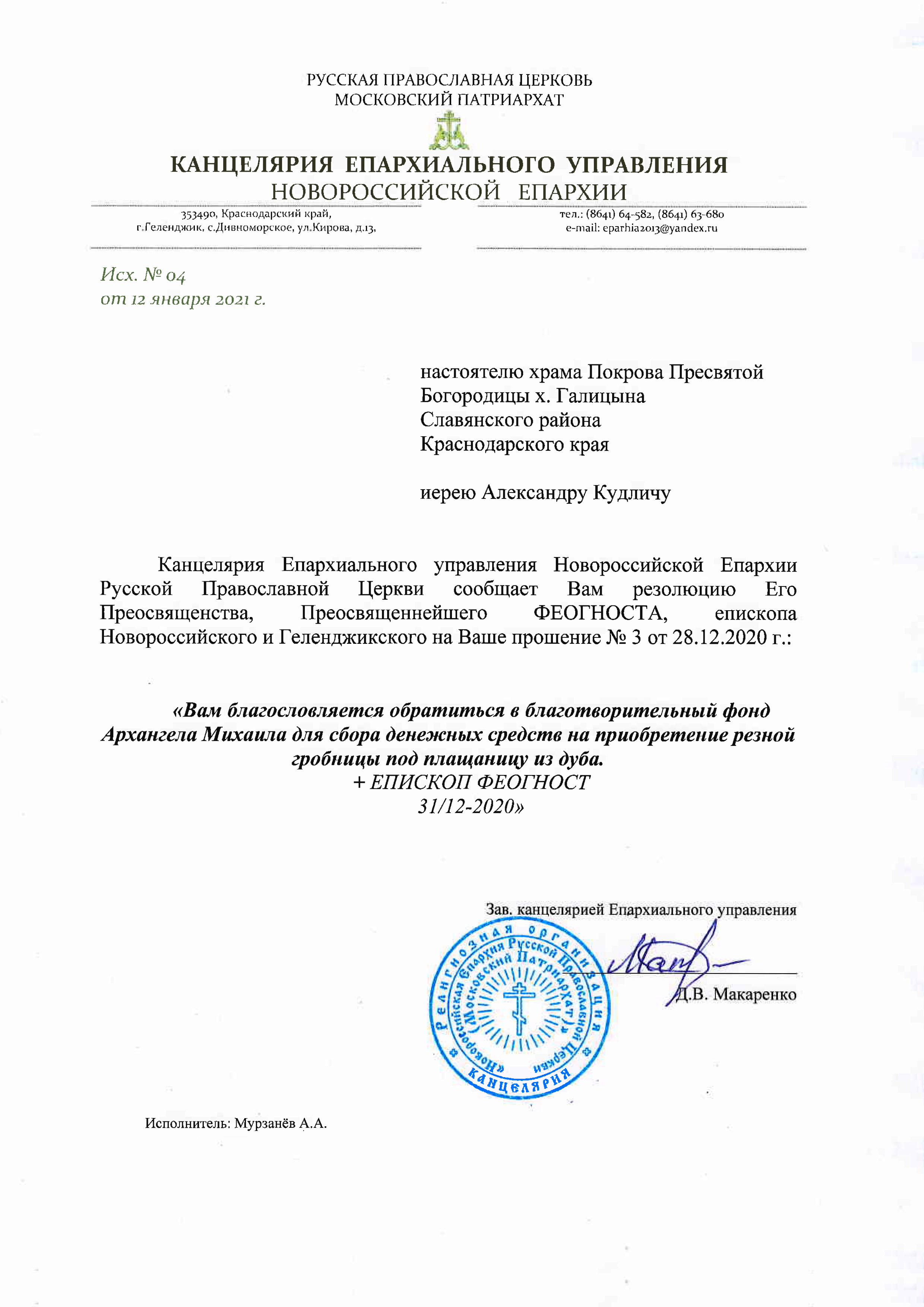 - Благословение Епархии на обращение в Фонд