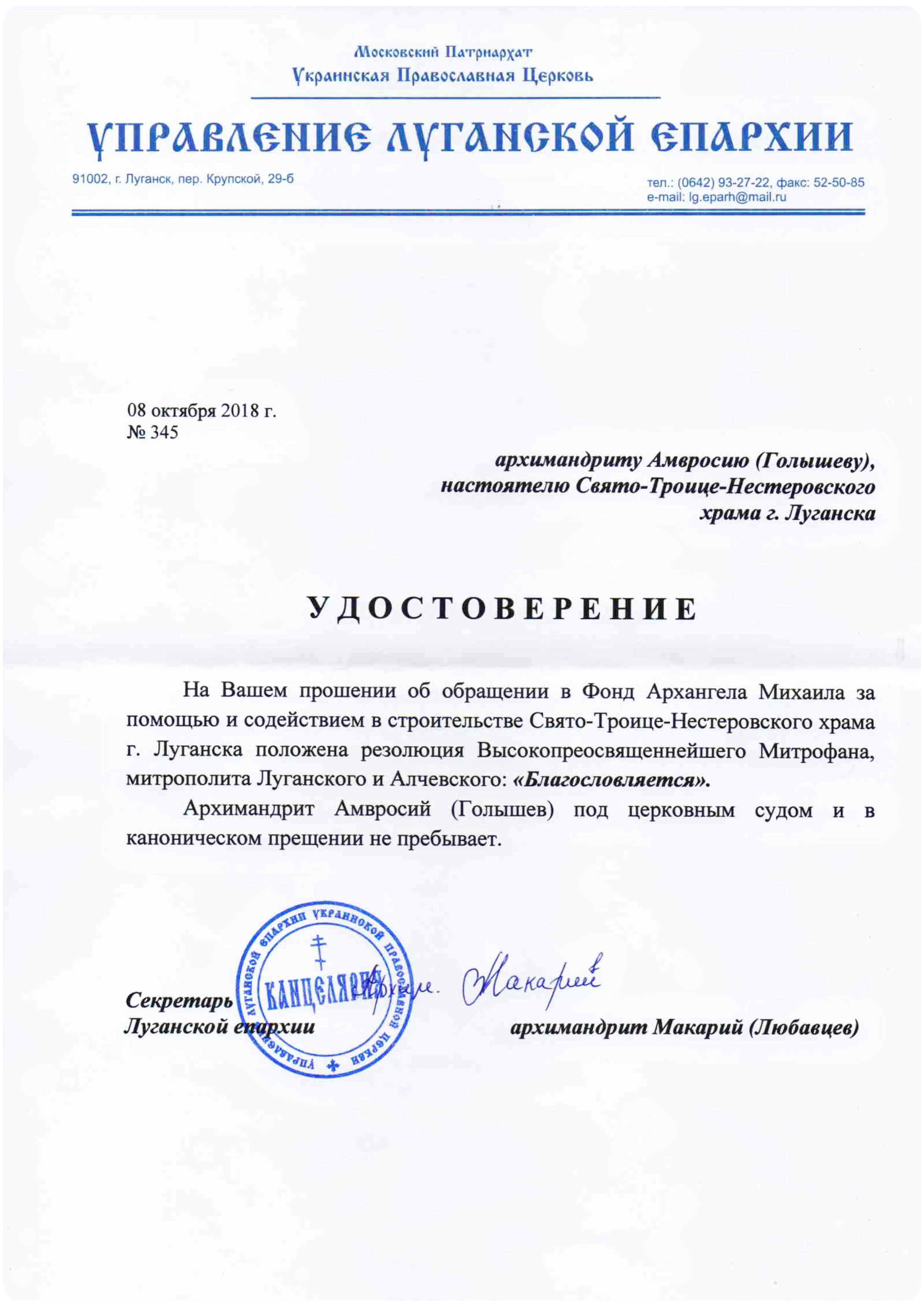 - Благословение Епархии на обращение в Фонд