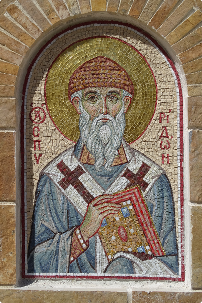 Мозаичисты выбрали для икон стилистику, которая гармонирует с природой и архитектурной средой Корфу, где много светлого камня, много белого, терракотового, бежевого. Природа радует богатством цветов и обилием солнца. В России большую часть года световой день короток, а погода пасмурна. Поэтому в нашей стране мозаики обычно привлекают взор яркими красками: золотая и цветная смальта становится светлым цветовым пятном на общем сдержанном, темноватом фоне. Для Греции необходим другой подход. Поэтому художники приняли решение работать в приглушенной палитре. Они использовали не только смальту, но и натуральный камень. Такой подход оказался очень удачным. Светло-бежевые, немного грубоватые фоны не оттягивают на себя внимание, они как бы становятся продолжением облицовки стены. При ярком солнце они не слепят глаза, поэтому смотреть на мозаику комфортно в любое время суток. На сдержанных фонах фигуры святых выделяются особенно рельефно и выразительно. Небольшое количество золота – в нимбах – позволило подчеркнуть проникновенность ликов.
